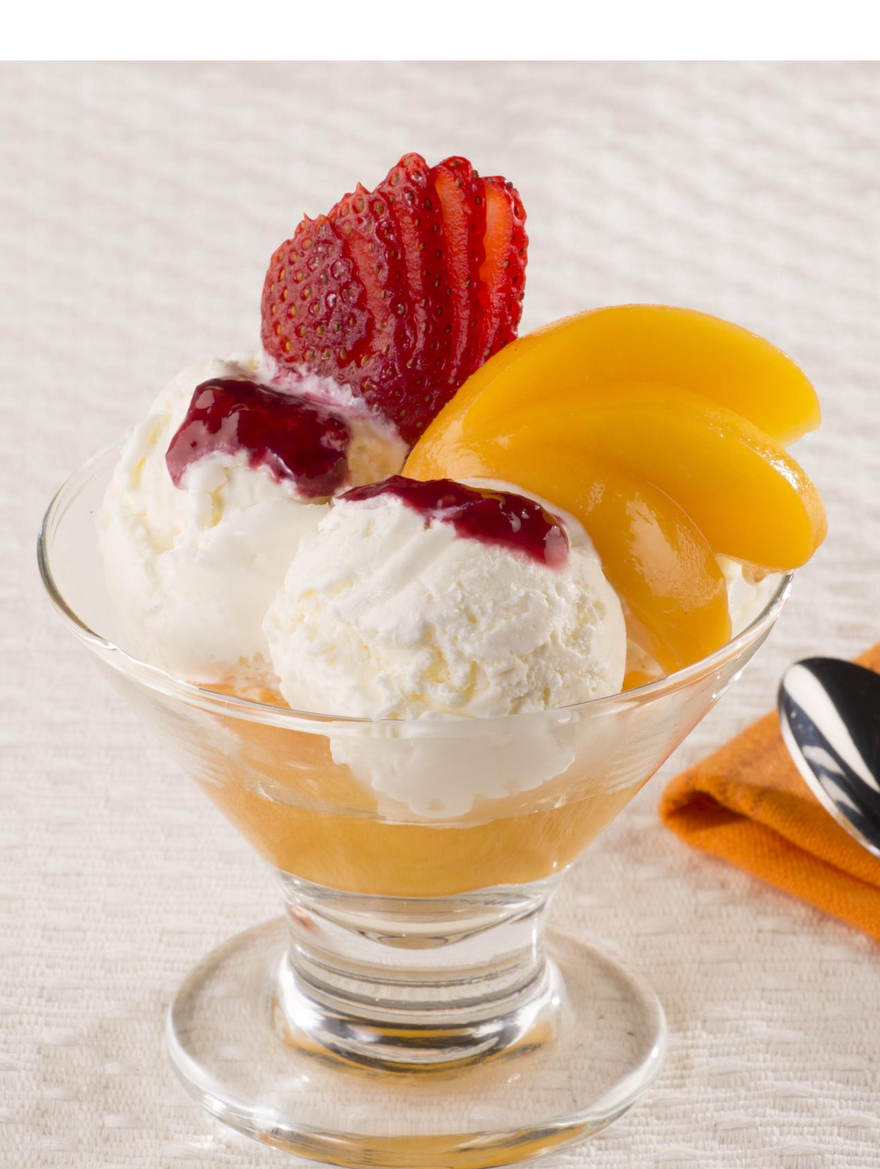 Deliciosa combinación de helado con durazno, crema de leche y Salsa de mora.